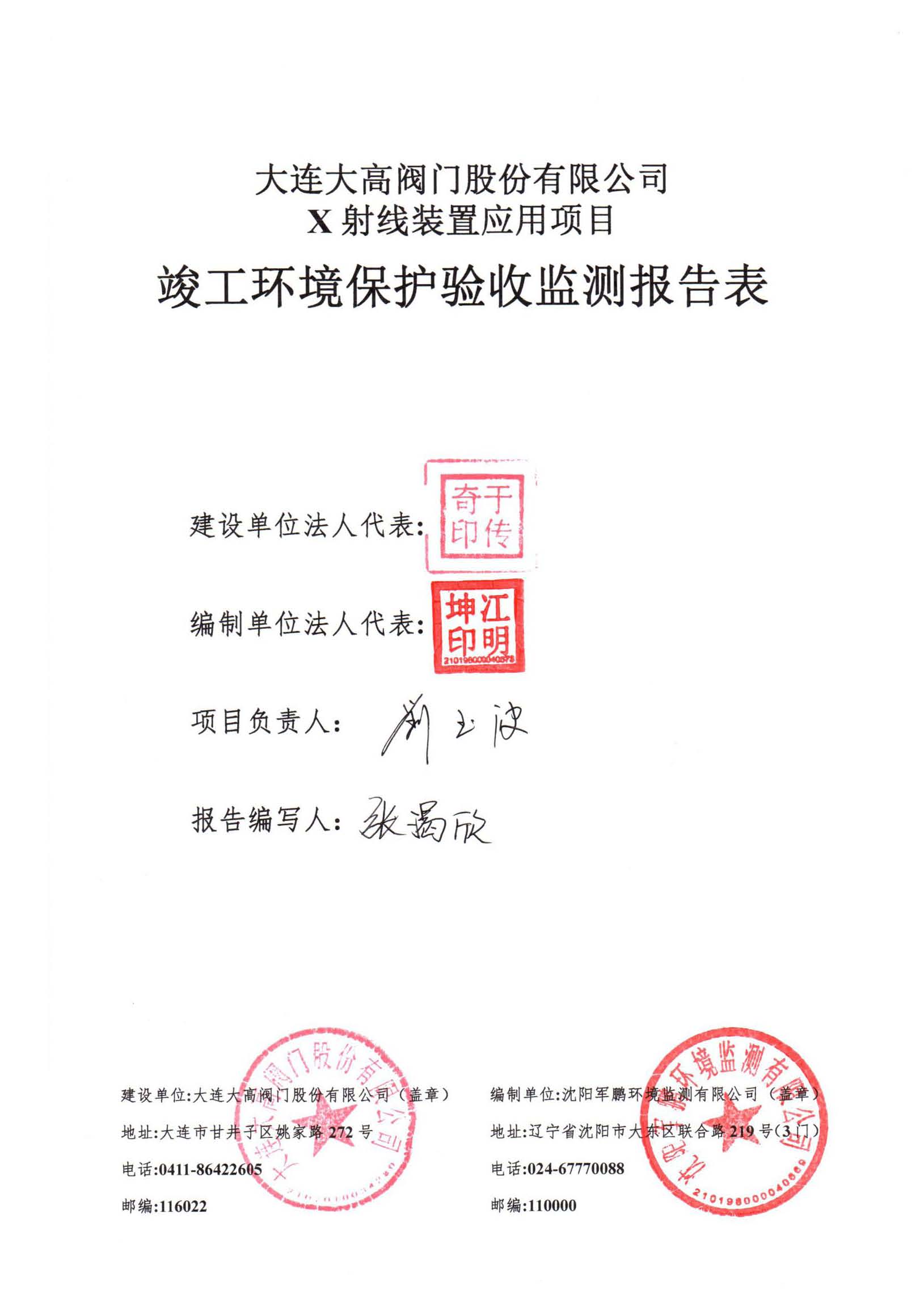 大連大高閥門股份有限公司X射線裝置應(yīng)用項(xiàng)目竣工環(huán)境保護(hù)驗(yàn)收公示2019-05-20 大連大高閥門股份有限公司X射線裝置應(yīng)用項(xiàng)目竣工環(huán)境保護(hù)驗(yàn)收公示 據(jù)《國務(wù)院關(guān)于修改〈建設(shè)項(xiàng)目竣工環(huán)境保護(hù)管理?xiàng)l例〉的決定》(國務(wù)院令第682號(hào)),以及環(huán)保部《關(guān)于發(fā)布&..[全文]