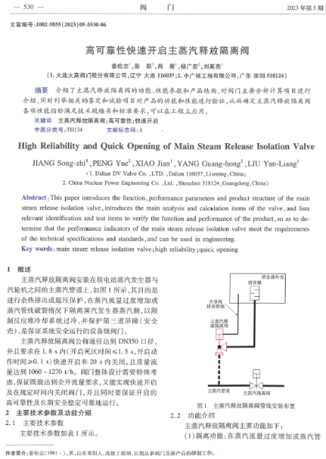 授權(quán)發(fā)明專利3項(一種用于核電的先導(dǎo)式蒸汽釋放隔離閥動態(tài)性能的測試裝置及測試方法、主蒸汽釋放隔離閥、雙活塞先導(dǎo)式帶彈簧復(fù)位結(jié)構(gòu)的角式截止閥),授權(quán)實(shí)用新型專利3項(一種多位置及位移檢測裝置、一種雙活塞先導(dǎo)式帶彈簧復(fù)位結(jié)構(gòu)的角式截止閥、一種主蒸汽釋放隔離閥),在《閥門》2023年第5期發(fā)表論文《高可靠性快速開啟主蒸汽釋放隔離閥》1篇,文章編號:1002-5855(2023)05-0530-06。