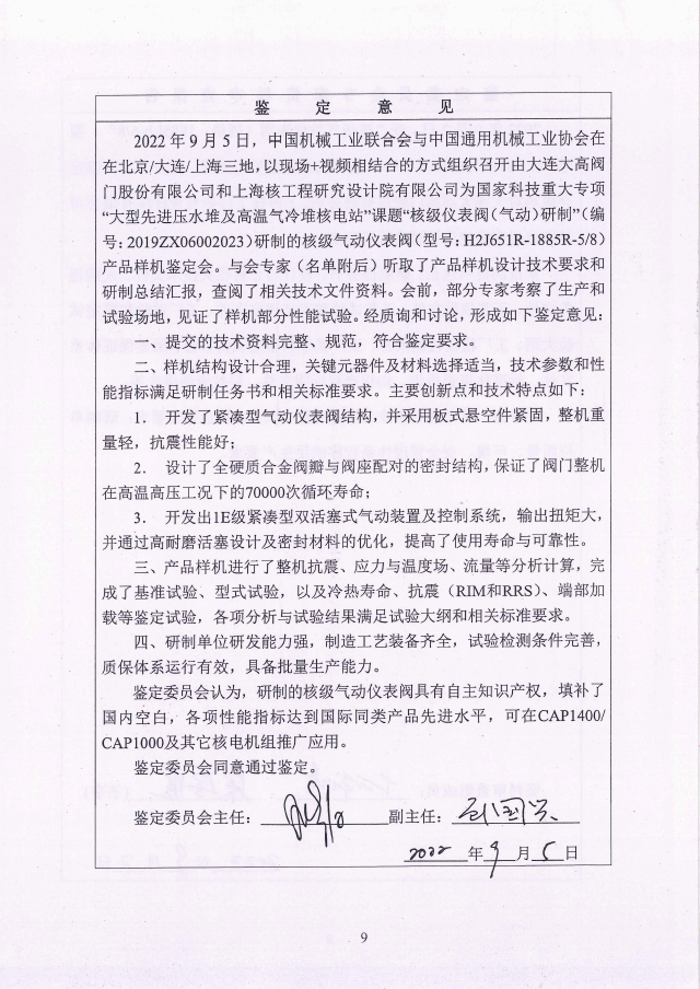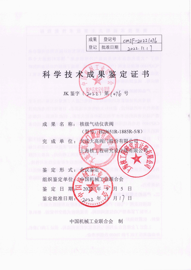 2022年9月5日,通過了中國機(jī)械工業(yè)聯(lián)合會(huì)與中國通用機(jī)械工業(yè)協(xié)會(huì)組織的樣機(jī)鑒定,鑒定意見為:研制的核級(jí)氣動(dòng)儀表閥具有自主知識(shí)產(chǎn)權(quán),填補(bǔ)了國內(nèi)空白,各項(xiàng)性能指標(biāo)達(dá)到國際同類產(chǎn)品先進(jìn)水平,可在CAP1400/CAP1000及其它核電機(jī)組推廣應(yīng)用。