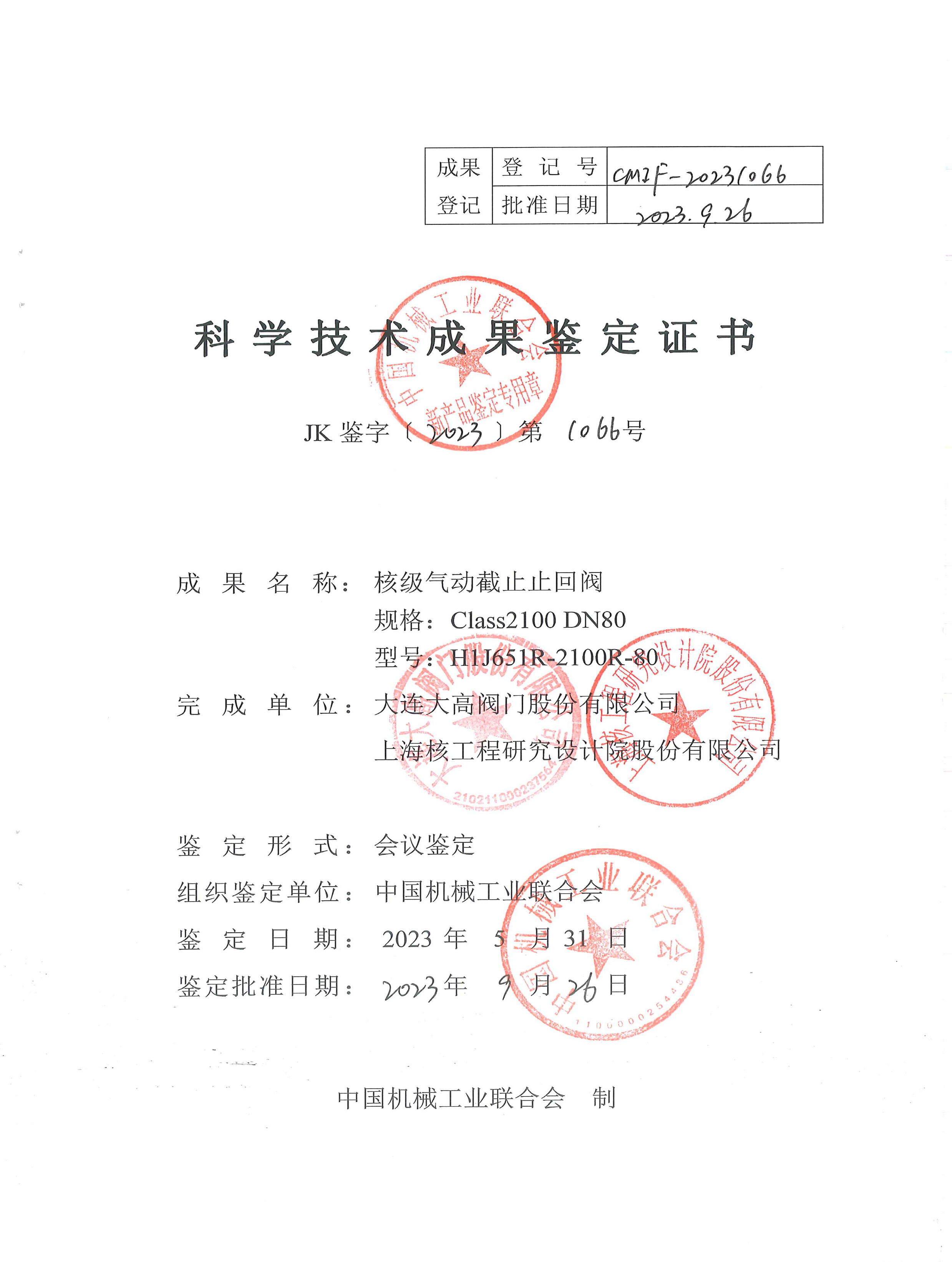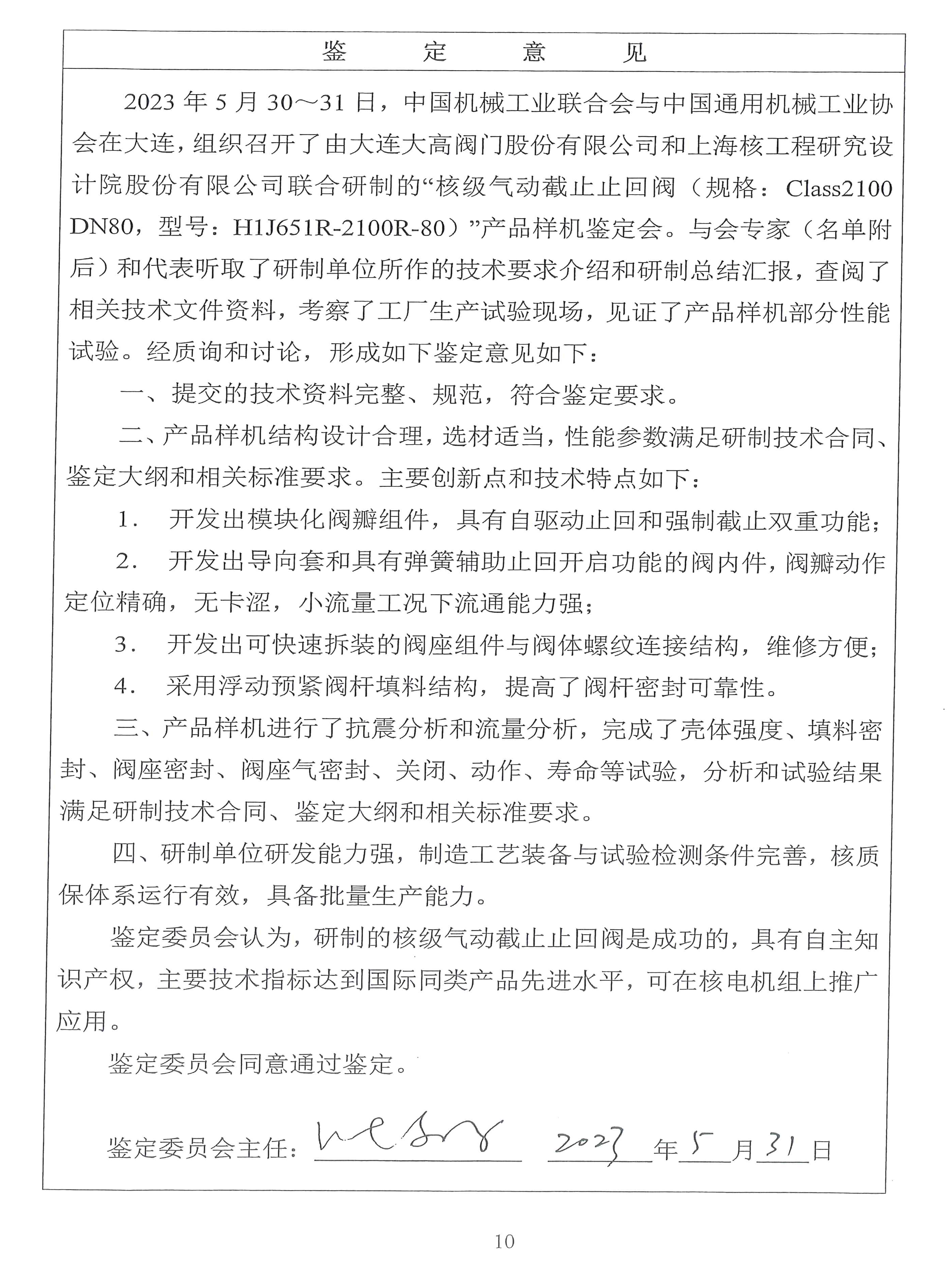 2023年5月31日,通過了中國機(jī)械工業(yè)聯(lián)合會與中國通用機(jī)械工業(yè)協(xié)會組織的樣機(jī)鑒定,鑒定意見為:研制的核級氣動截止止回閥是成功的,具有自主知識產(chǎn)權(quán),主要技術(shù)指標(biāo)達(dá)到國際同類產(chǎn)品先進(jìn)水平,可在核電機(jī)組上推廣應(yīng)用。